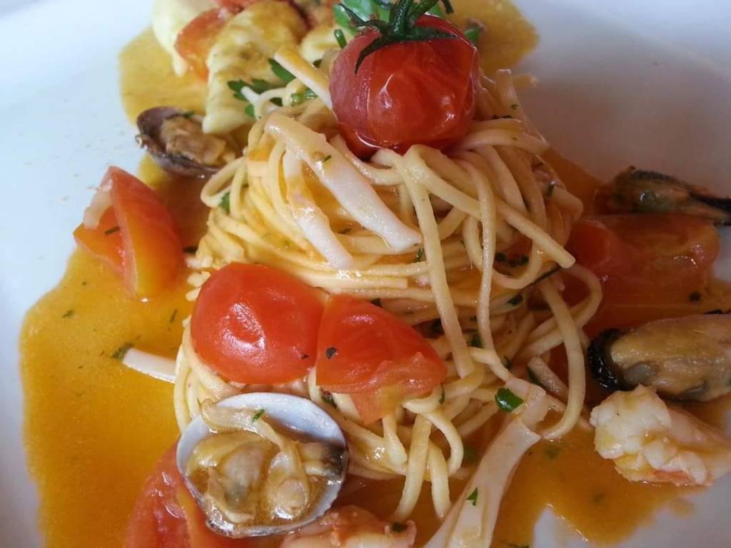 PROCEDIMENTO: Tutti gli ingredienti verranno cotti separatamente in una padella (Cottura di concentrazione) con olio extravergine, aglio in camicia . scaldare l’olio con aglio in camicia, scottare i calamari con il peperoncino qb:, il tutto deve durare 1 minuto per rendere il prodotto croccante e di colore bianco per le seppie stesso procedimento, gamberi messi a marinare a crudo con olio e basilico , cozze e vongole cotte in sautè alla marinara poi sgusciate . infine mettere in padella i pomodorini sardi marinati e saporiti al basilico aggiungere tutti gli ingredienti, cucinare i tagliolini in acqua salata e amalgamare con olio e acqua di cottura creare un’emulsione, piatto con effetto straordinario con molti colori e digeribile.