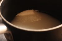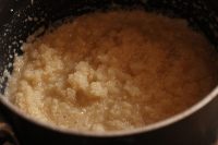 Mettete le mandorle nel tritatutto (4). Azionate il tritatutto e riducete le mandorle in farina finissima. In una padella antiaderente versate lo zucchero. Unite l’acqua (5) allo zucchero nella pentola. Accendete il fuoco e lasciate andare fino a che lo zucchero non si sarà sciolto completamente. Unite il cucchiaio di miele e di estratto di vaniglia. Aggiungete la farina di mandorle (6) e mescolate per bene.