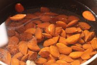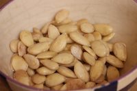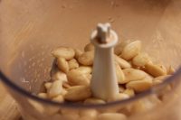 Riempite una pentola d’acqua e portatela a bollore. Prendete le mandorle (1) e sbollentatele per circa 3 o 4 minuti (2). Scolate le mandorle e asciugatele velocemente con la carta da cucina. Private le mandorle della loro pelle (3) pizzicando la buccia con le dita, in questo modo scivoleranno via facilmente.