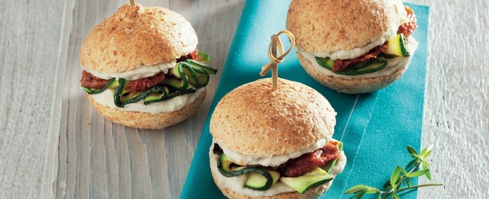 Scolate e asciugate i pomodorini secchi con carta da cucina. Tagliate i panini a metà e spalmate le due parti con la crema di fagioli.