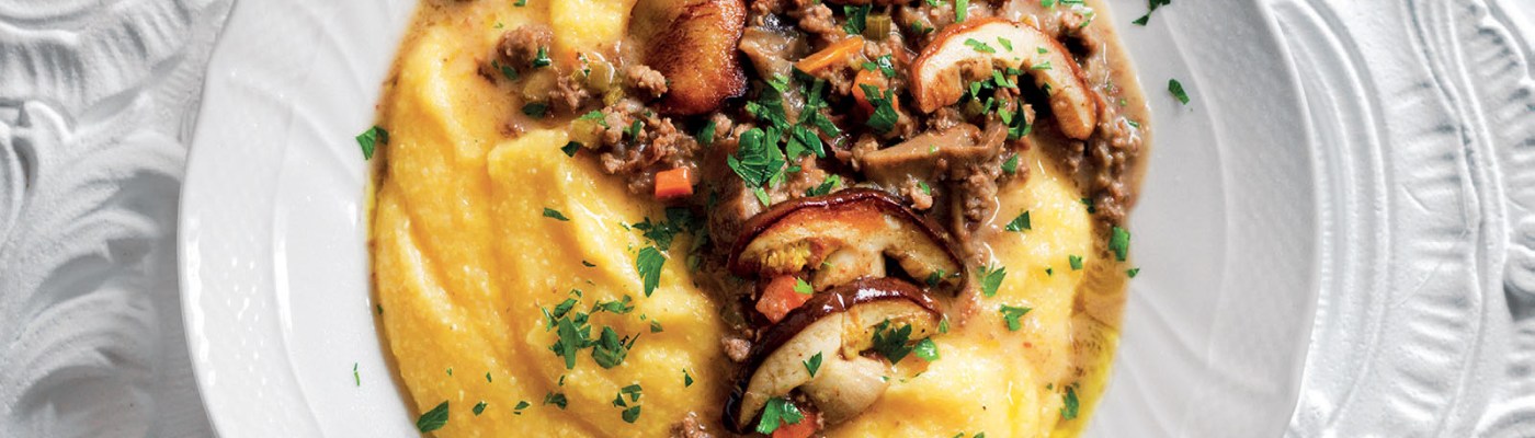 Per la ricetta della polenta e ragù di funghi, portate a bollore 1,5 litri di acqua con 2 cucchiai di olio e una manciata di sale, quindi versate la farina a pioggia, mescolando con una frusta per evitare che si formino i grumi; cuocete la polenta a fuoco moderato per 50 minuti, girandola spesso.