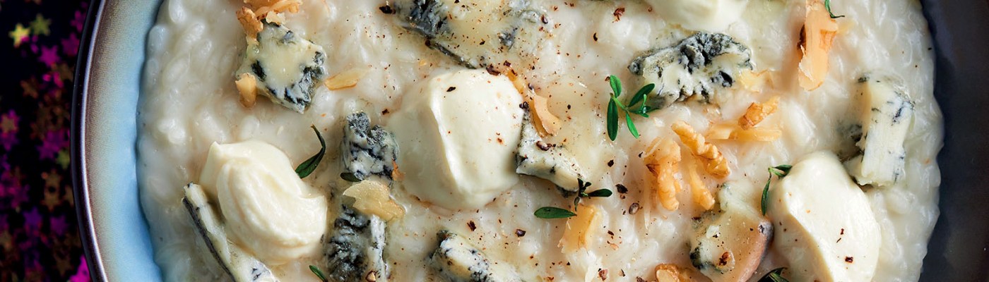 Sminuzzate una manciata di gherigli di noce. Tagliate a pezzetti il gorgonzola. Mantecate il risotto con il mascarpone, regolando di sale; distribuitelo nei piatti, completate con i pezzetti di gorgonzola, le noci, maggiorana e, a piacere, fiocchetti di mascarpone.