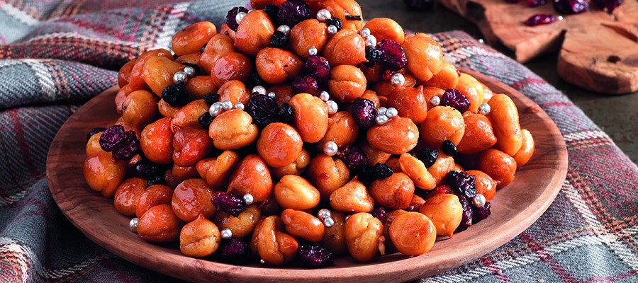 Raccogliete il composto in una tasca da pasticciere con bocchetta liscia (ø 0,6 cm), distribuitelo su una placca foderata di carta da forno in ciuffetti grandi come una nocciola e infornate a 180 °C per 20’. Pestate 4 chiodi di garofano e mescolateli con lo sciroppo di acero. Mettete tutto a scaldare in una casseruola ampia; quando lo sciroppo inizia a fremere, unite tutti gli struffoli e mescolate fino a quando non ne saranno completamente ricoperti.