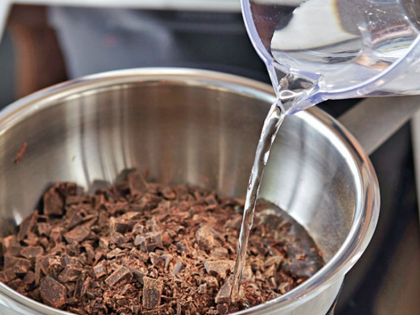 Trasferisci il cioccolato in una ciotola di metallo, versa 1,8 dl di acqua e fai fondere a bagnomaria, mescolando con un cucchiaio di legno.