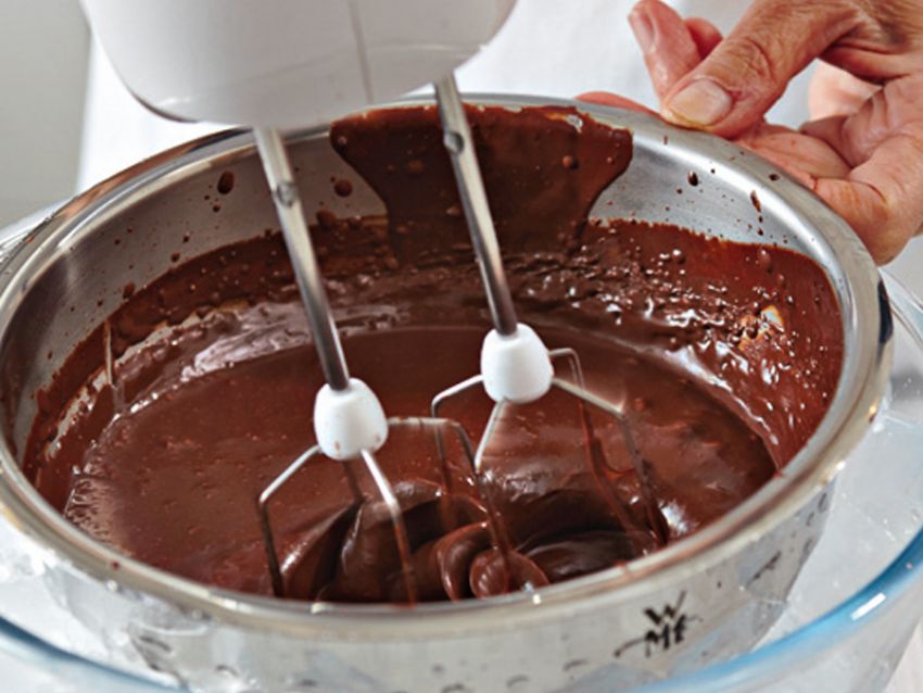 Una volta fuso, togli il cioccolato dal bagnomaria, trasferisci la ciotola in un’altra colma di ghiaccio e inizia a montare con le fruste elettriche.
