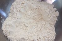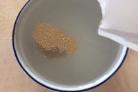 Mettete la farina setacciata in un recipiente ampio e fate un buco al centro (1). Mettete il lievito di birra nell’acqua e nello zucchero (2) e scioglietelo mescolando, senza far rimanere grumi (3).
