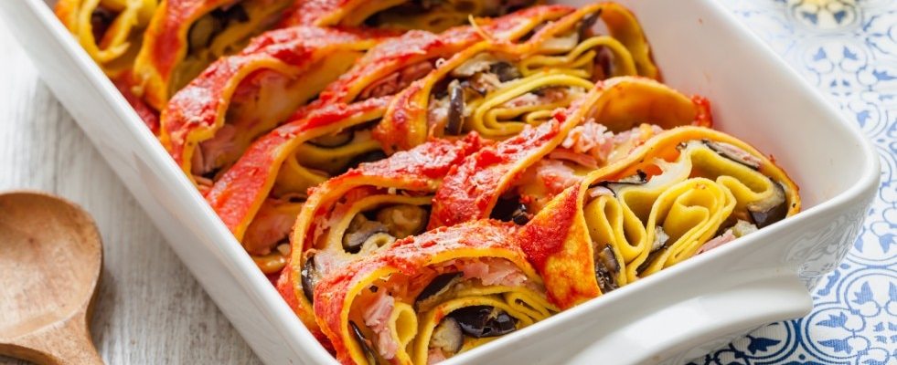 Quella che vi presentiamo è una ricetta casalinga che arriva dalla Calabria, precisamente dalla cucina di Zia Gianna: il rotolo di pasta all’uovo ripieno con melanzane, prosciutto cotto e scamorza è un primo piatto (o anche piatto unico) super gustoso realizzato con ingredienti semplici. Provatelo subito.