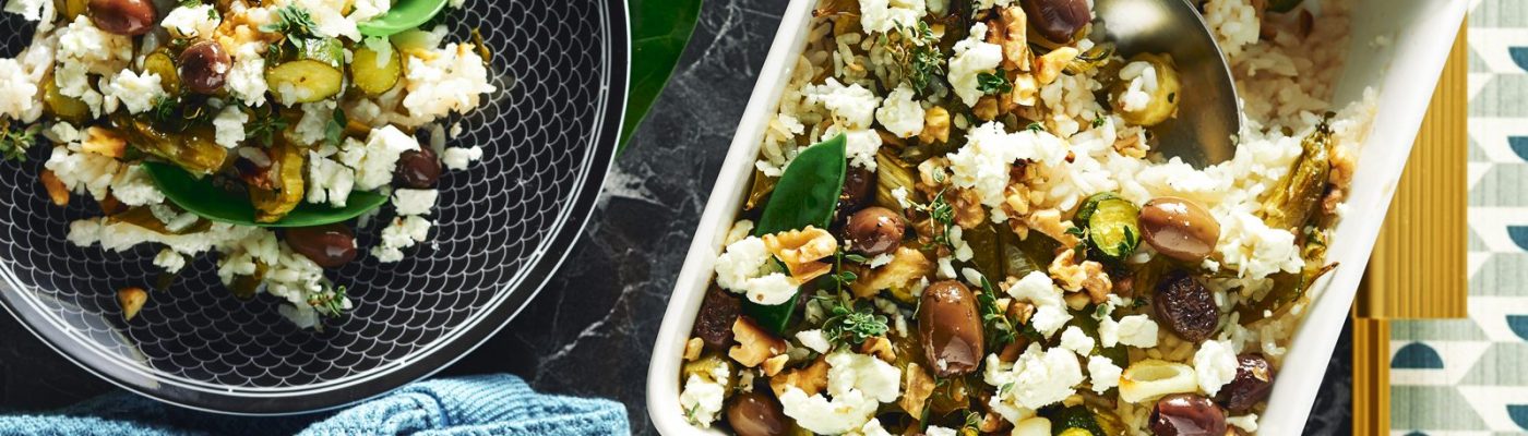 Servite il riso completandolo con la feta sbriciolata, le olive rimaste, le noci spezzettate e un po’ di scorza di limone grattugiata.